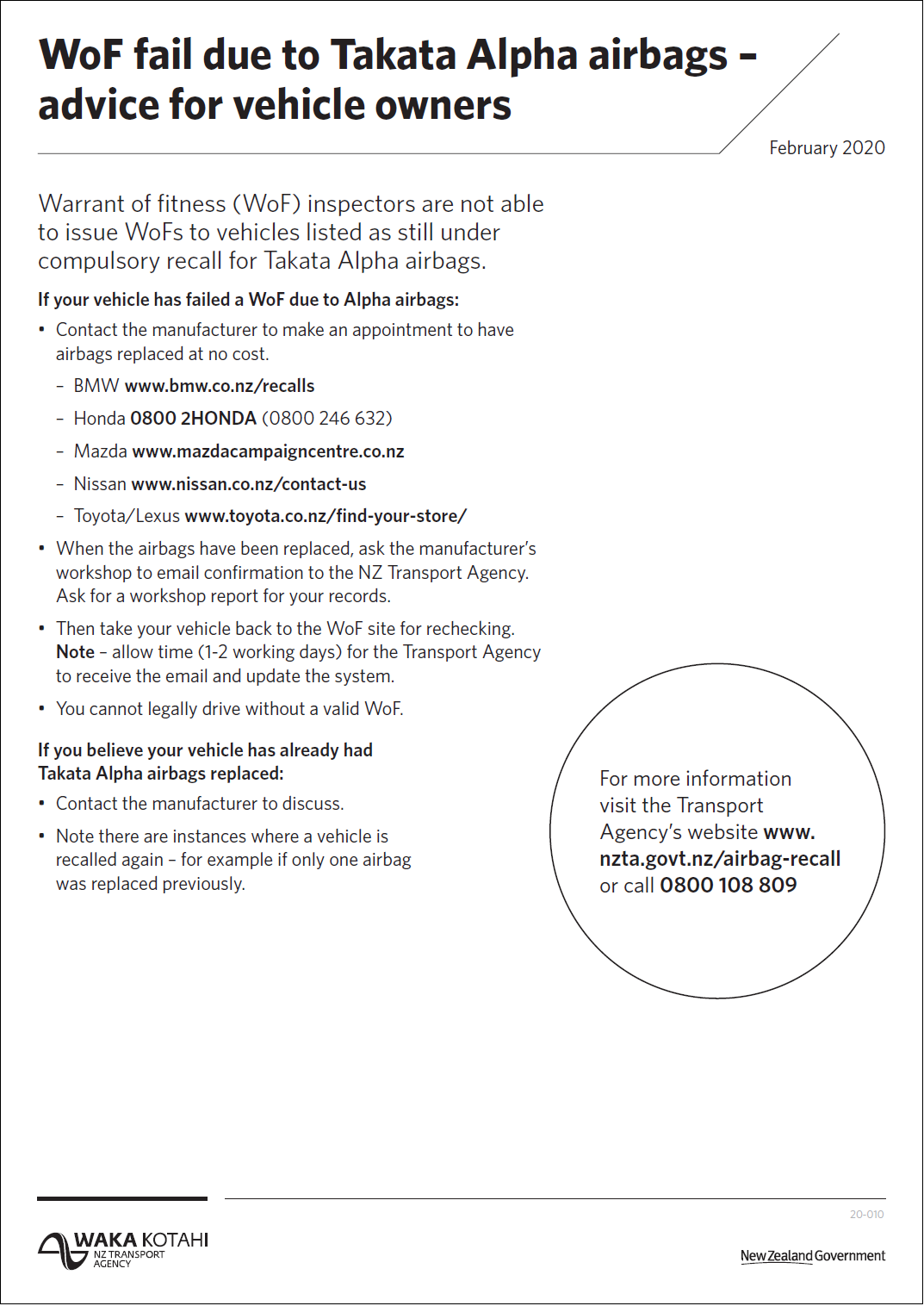 The flyer advises vehicle owners to contact the vehicle manufacturer to make an appointment to have airbags replaced at no cost. When the airbags have been replaced, the manufacturer’s workshop will email confirmation to the Transport Agency. We advise owners to allow one to two days, to ensure we’ve received the email and updated the system, before bringing the vehicle back to you for rechecking.