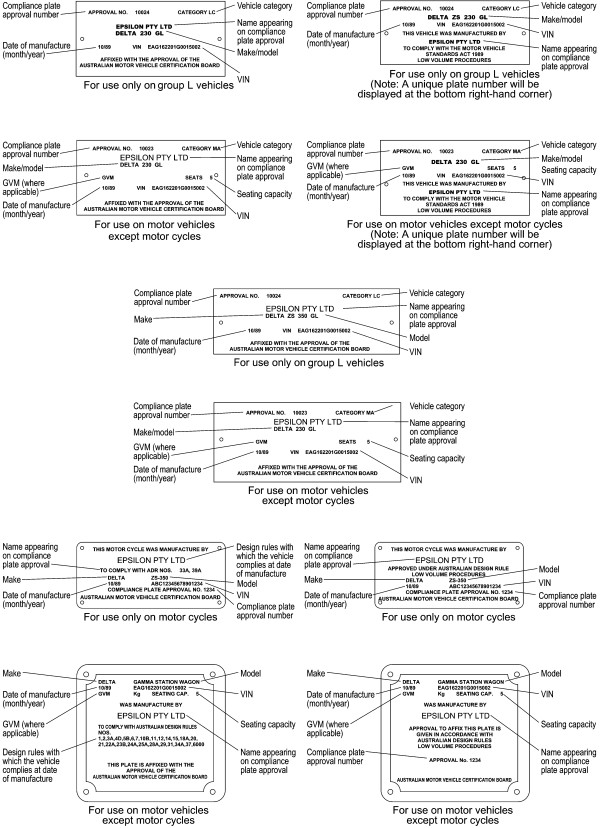 The bulk of the content of this section is included in Tables of vehicle class standards requirements and Lists of approved standards. That is, vehicle of group L or class MA, MB, MC, MD1 or NA must comply with approved standards as specified in Tables of vehicle class standards requirements and Lists of approved standards.