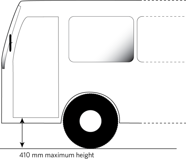 a) unless the entrance is of an outdoor access vehicle or is a left-front passenger entrance providing access for less than three passenger seating positions, the distance from the ground to the tread surface of the lowest entrance level must be less than 410mm when measured with the unladen vehicle: