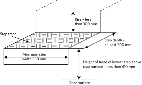 1. Except for a stretch limousine, if the floor of a heavy PSV at the entrance or exit door is more than 410mm above the surface of the level roadway, there must be a step or ramp which complies with the following requirements: