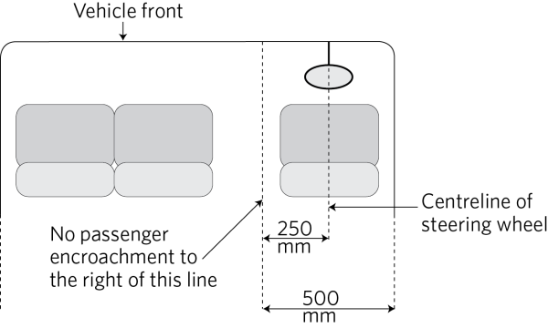 2. If there are passenger seating positions to the left of the driver’s seat, the seats and driving controls must be designed and located so that the shoulder width of the passenger seat does not encroach into the space required by the driver when driving. On a motor vehicle that entered service as a PSV on or after 1 September 1999 the space designed to be clear of encroachment must: