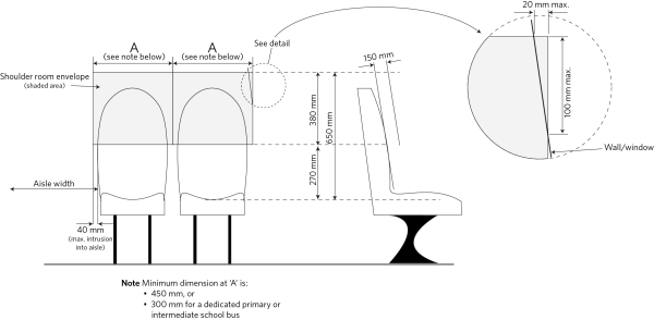 Shoulder room is measured 150mm in front of the backrest, above the seating surface, parallel to the seat width, at a height between 270mm and 650mm above the centre of the seat cushion. Shoulder room may encroach into the aisle provided that the encroachment is less than 40mm on each side of the aisle.