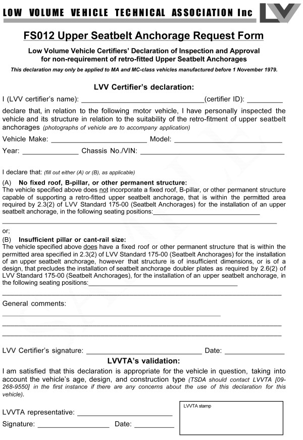 FS012 upper seatbelt anchorage request form