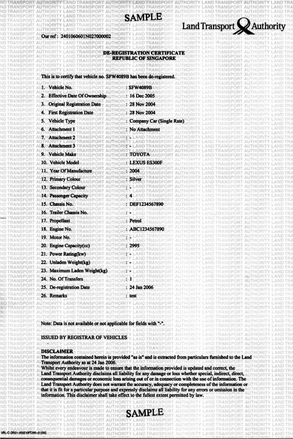 Singapore deregistration certificateNote: NZTA will accept electronic de-registration certificates from Singapore but only on the proviso that they are emailed directly to a KSDP from Singapore Land Transport.