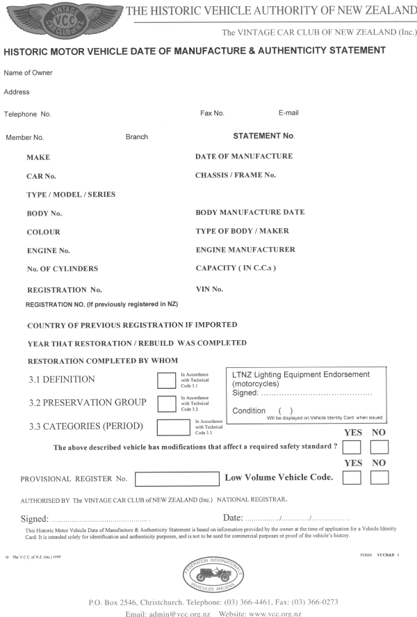 Sample Vintage Car Club certificate of authentication