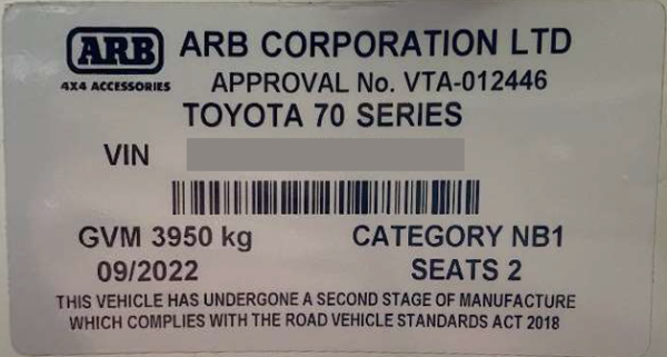 a) compliance with FMVSS is confirmed by a valid FMVSS plate or label which incorporates the vehicle chassis number and the approved modifier's name, that is permanently attached to the vehicle (refer image above); and