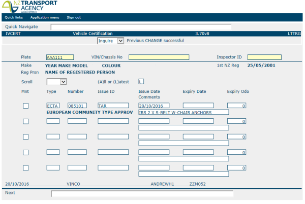 IVCERT vehicle certification screen
