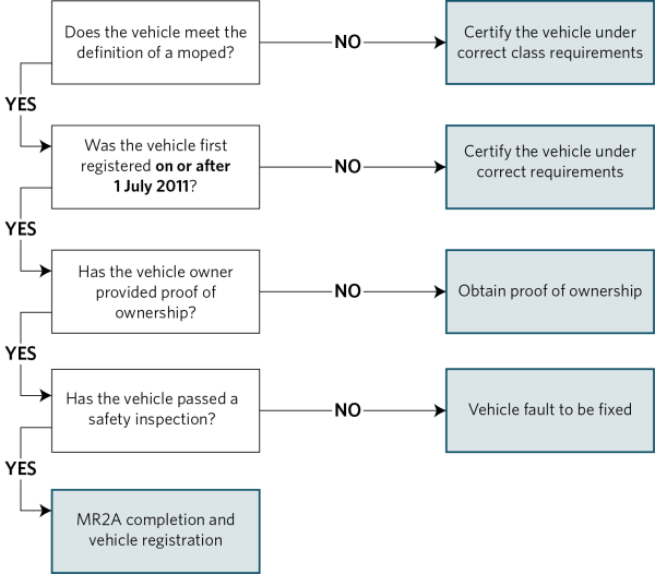 The following flowchart explains the procedure for processing a re-registered moped that was first registered in New Zealand on or after 1 July 2011.