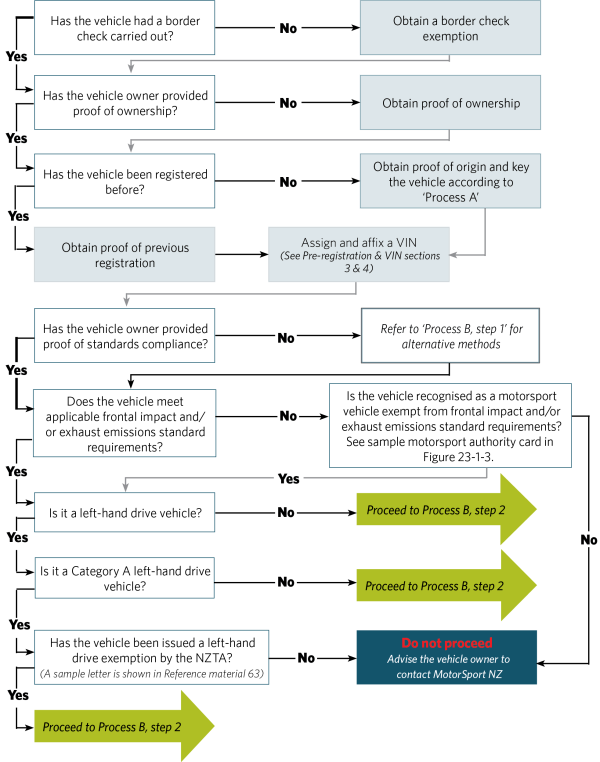 Flow diagram Figure 23-1-1 explains the procedure for processing an imported motorsport vehicle for entry certification.
