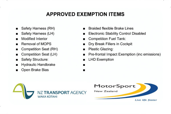 NZTA and MotorSport New Zealand (MSNZ) have agreed on a process to allow a limited number of genuine dedicated motorsport vehicles to be imported and certified for use on New Zealand roads. These vehicles may participate in MSNZ-sanctioned events that have road stages requiring the vehicle to have a current WoF and registration. Such vehicles may be driven on the road to get to and from MSNZ events, and for servicing and certification. They are not for ‘daily driver’ use.