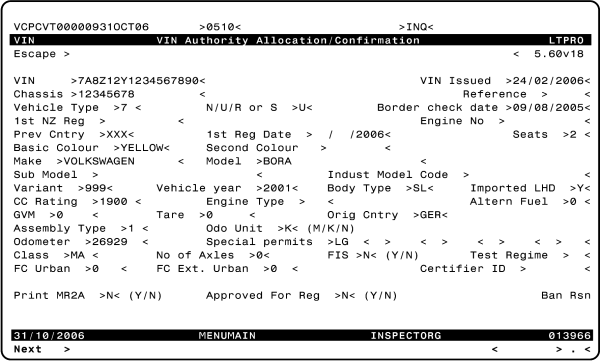 If a MotorSport NZ authority card is issued for a vehicle, the code LVAC (low volume authority card) must be entered in the IVCERT screen. The Certifier ID to be recorded for a motorsport authority card is >TMWM1<.