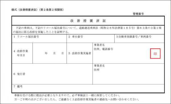 Recall completion certificateA Japanese Ministry of Land, Infrastructure, Transport and Tourism (MLIT) process document like the image below can be used to provide evidence of a Shaken test (Japanese WoF). A vehicle can only pass a Shaken test if it has had its Takata Aplha airbags replaced. If a completed recall certificate for the vehicle in question is presented with a dealers stamp on it, it can be accepted as evidence that the vehicle in question can pass a Shaken test and therefore has had its airbags replaced. It can be accepted as proof that a vehicle has been rectified at a dealership level but might not yet have come off their website.