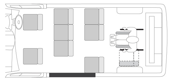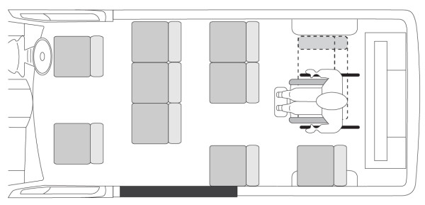 Multi-use wheelchair positionsA seating position that can be used for either a wheelchair or seat, but not both simultaneously, is only to be counted as one seat. If a wheelchair position takes up more than one multi-use seating position, the number of seating positions is the highest possible count of seated passengers. Figure 45-1-3. 11 seat omnibus