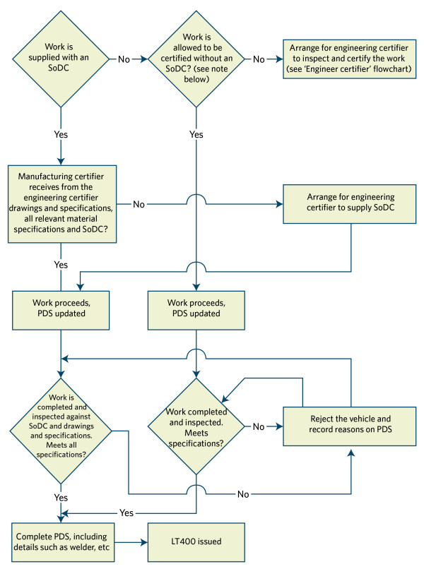 Consequently, any item or component manufactured using a SoDC from a non-practicing HV certifying engineer cannot be signed off by an HV manufacturing certifier, but must be re-certified by a current HV certifying engineer of the appropriate category.