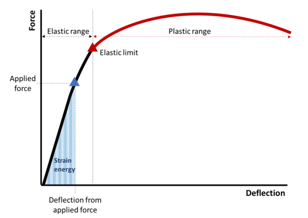 The results are reproduced using a load-deflection curve (refer to Hooke’s Law). When force is applied to a structure it deforms and stores potential energy. The strain energy is the potential energy stored due to the deflection. Up to the elastic limit, the strain in the structure is also elastic and will be recovered when the load is removed (i.e. the material returns to its original length). However, if the material is loaded beyond the elastic limit, a permanent deformation in the material will take place, this is referred to as plastic strain. The plastic strain of the structure is necessary to achieve energy absorption.