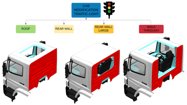 - The modification only reduces the strength or stiffness of the cab by less than 25% (e.g. modifications such as enlarging the rear window area but not cutting into the main ring frames of the cab structure), and