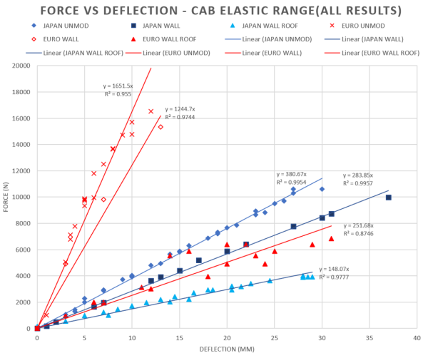 The results of all the tests in the elastic range are shown in Figure 20-1-11, including the curve gradients and linear regression values. Linear regression is a statistical method that allows one to summarise and study relationships between two continuous (quantitative) variables. The results show a strong linear (proportional) relationship between force and displacement in the linear elastic range (as expected). The close clustering of data points between tests shows repeatability of the experimental setup. The difference in maximum load capacity between the Japanese and European cabs is primarily due to the size of truck to which they were fitted (i.e. different GVMs).