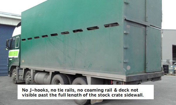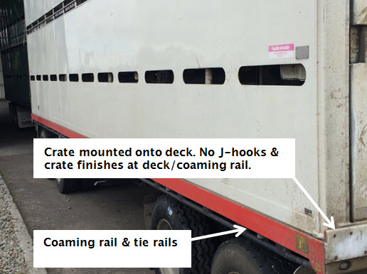 A certificate of fitness inspector can be satisfied in regard to the certification of the stock crate J-hook mountings if a plate or label providing all the information above is attached to the crate and there is a separate load anchorage certification plate fitted to the vehicle to cover the deck mounting points (coaming rail) used to secure the stock crate.