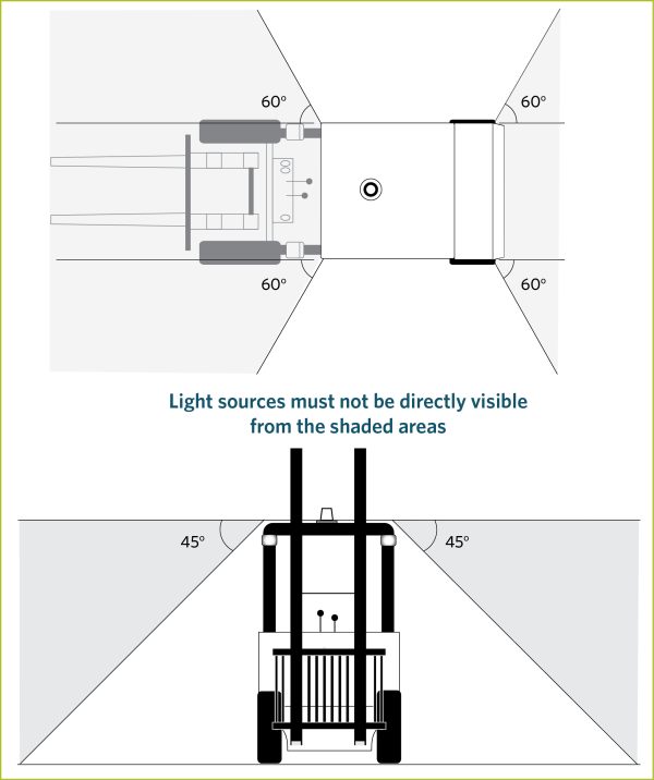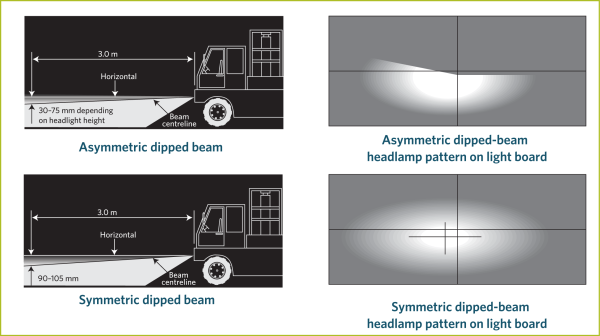 5. A forklift is fitted with a dipped-beam headlamp where the maximum intensity of the beam is projected to the right.