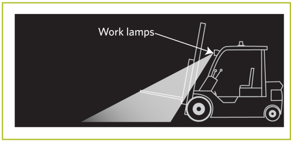 Work lamp means a high-intensity lamp, which is not necessary for the operation of the vehicle but is designed to illuminate a work area or scene, and includes a scene lamp, a spot lamp and an alley lamp. In the case of a forklift without headlamps, forward-facing work lamps must be fitted to illuminate the road ahead during the hours of darkness.