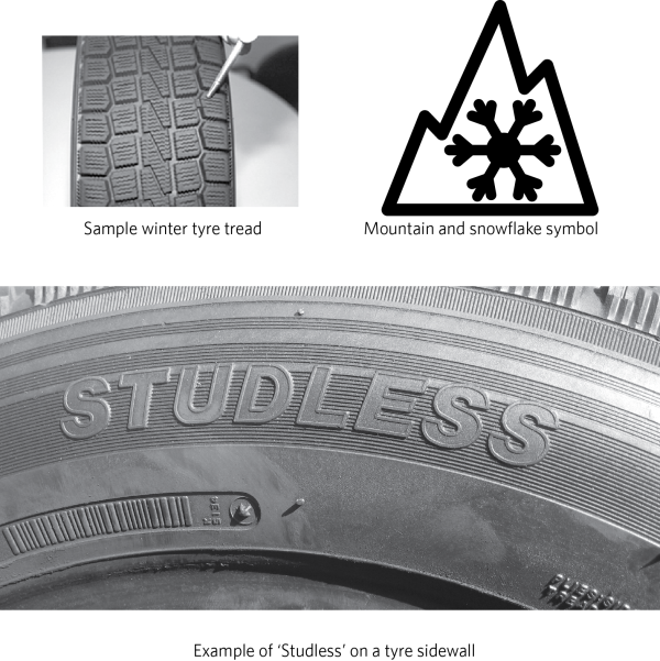Winter tyre: means a tyre that is principally designed to be operated at temperatures below 7 (degrees) C. Winter tyres have a distinctive tread pattern that consists of deep square patterned tread blocks that have small zig-zag grooves called sipes that allow the blocks to flex to maintain grip. In addition to the distinctive tread pattern, winter tyres usually have one or both of the following markings: the 3 Peaks Mountain and Snowflake Symbol (3PMSF) or the word 'Studded' or 'Studless' (see Figure 10-1-3).