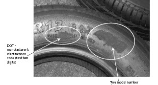 The circled areas show where information has been removed so that the tyre can no longer be identified. |