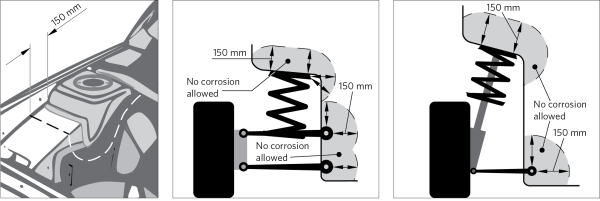 Note 9The only other allowable methods of adjusting vehicle ride height without LVV certification are leaf spring blocks (as per below requirements) or adjustment of OE equipment (torsion bars or OE adjustable air suspension). Note 10When determining if there is sufficient travel remaining, consider a case where the vehicle is laden and in use Note 11Sufficient clearance must be maintained from the travel-limiting bump stop (not an O.E spring aid). The spring aid and/or bump stop must not be modified. A spring aid is a low-density conformable material that is fitted inside a coil spring or above a leaf spring by a vehicle manufacturer to assist the spring and acts as the bump stop only once it is fully compressed. The spring aid may be contacted at any loading condition to increase the vehicle’s spring rate, but the vehicle must retain sufficient wheel travel as per Note 10 above. A bump stop is a small high-density rubber bumper that is designed to stop vehicle suspension or driveline components from coming into contact with the vehicle structure at the extremes of its suspension travel and is not designed to carry the load of the vehicle for sustained periods of time. Note 12Rebound wheel travel should be measured as the difference between the distance from the top of the tyre and the wheel arch with the vehicle resting on the ground and the top of the tyre to the wheel arch with the vehicle lifted so that its tyres are clear of the ground (suspension hanging in full rebound). This difference must be greater than 40mm. Note 13Does not include such items as exhaust pipes and exterior body panels that do not contribute to the structural strength of the vehicle. Figure 9-1-1. Corrosion limits around front or rear suspension anchorages