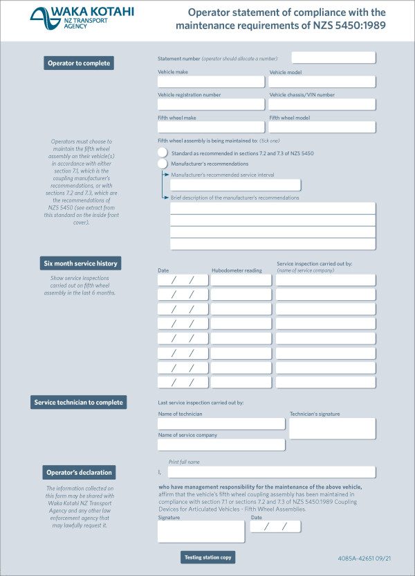 7. An ‘Operator Statement of Compliance with the Maintenance Requirements of NZS 5450: 1989’ (4085A form) is: