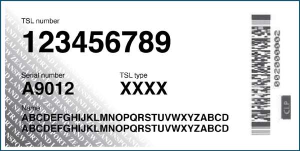 Every vehicle that operates in a goods service or vehicle recovery service must display a TSL label that identifies the TSL number the vehicle is presently operated under (see Figure 16-1-1). For CoF purposes, the vehicle inspector must record the number on the TSL label. Where there is no TSL label, or for a rental vehicle, the KSDP is expected to make a reasonable effort to request the TSL number from the driver. The TSL number must be entered into the system when the inspection is recorded, but where a TSL number cannot be obtained, fault code VLP must be entered.