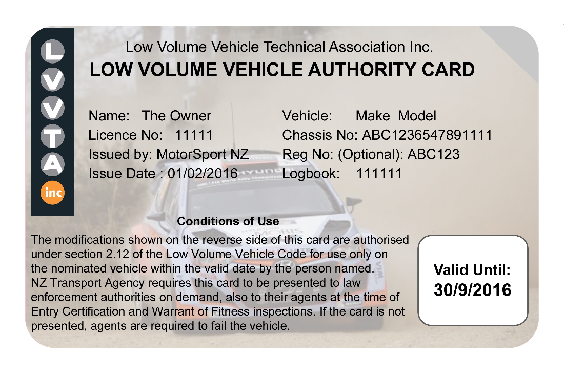 Note: Modification declarations were phased out in the early 1990s and totally replaced by LVV plates or authority cards in 1995. Figure 8-1-3. LVV Authority cards (can only be issued by MotorSport NZ and the NZ Hot Rod Association)