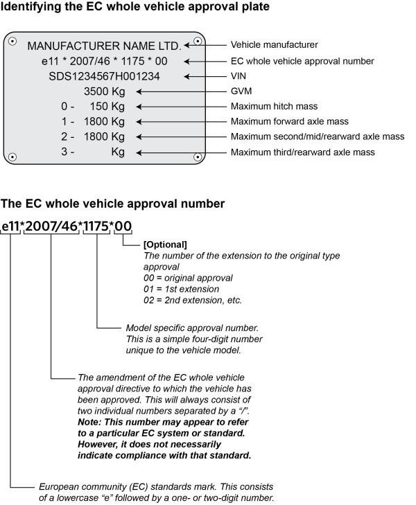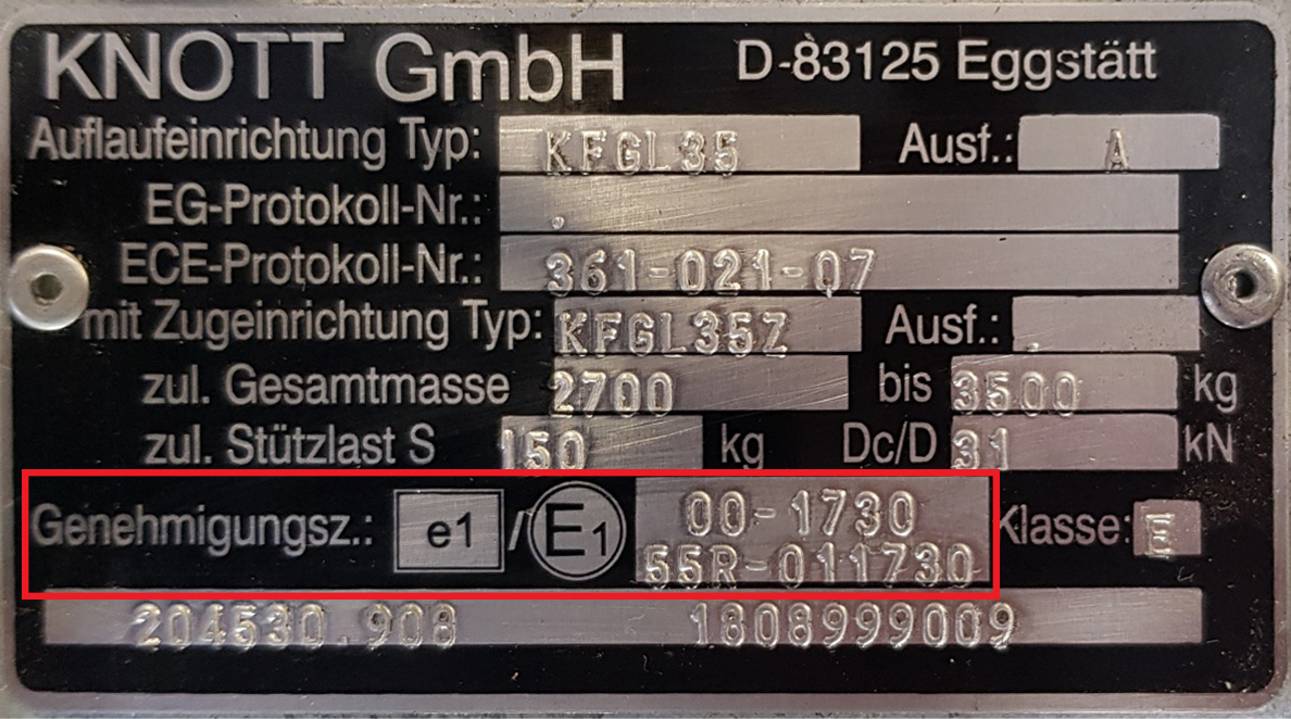 A trailer that has European whole vehicle type approval will have brakes compliant with UN/ECE Regulation 13. These trailers are identified by a plate very similar to the following: