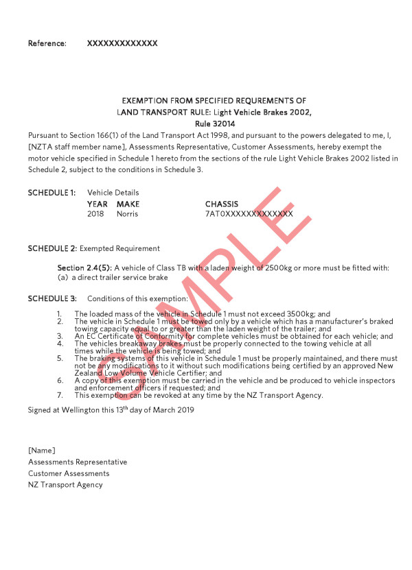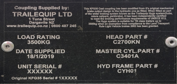 Trailers presented without a European approved braking system, as per the two sections above, must be presented with an exemption letter issued by the Transport Agency. An example of this may be seen below. These trailers are usually built in New Zealand and are usually fitted with a brake system manufactured in New Zealand. Some of these trailers will be fitted with a plate like the one shown below. All these trailers must have a VIN/chassis that matches that shown on the exemption letter.