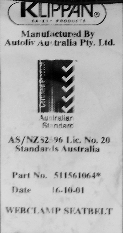 - a compliance label that is different to the other seatbelts that is not from a typical manufacturer